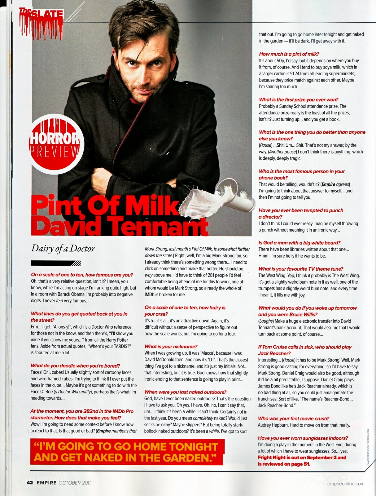 Hab die Zeitschrift (Empire, Ausgabe 10/2011) gerade im Original in der Hand, und die ist wirklich sehr lesenswert. Neben dem DT-Interview ist auch die Fright Night Kritik drin (3/5 Sternen) und noch zwei tolle Bilder von David, der bei ner Veranstaltung der Zeitschrift im Millenium Dome dabei war :sabber